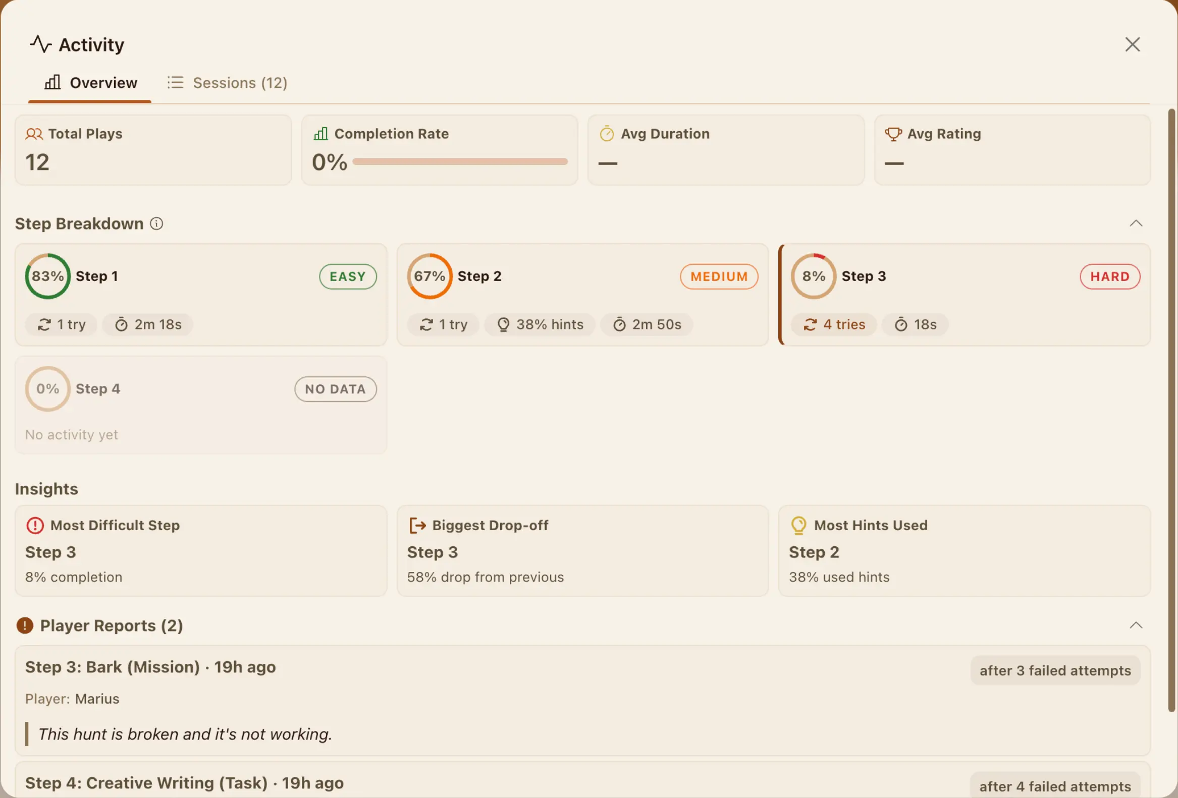 Creators had no visibility into how players interacted with their hunts. The backend captured session data as players progressed through steps, but none of it was surfaced. Anonymous sessions expire after 24 hours, so any analytics reading raw sessions directly would lose data over time. Every play event writes to two stores: a session record that expires and a running totals document that doesn't. The analytics service reads both, so recent sessions have full detail and lifetime metrics are always accurate.