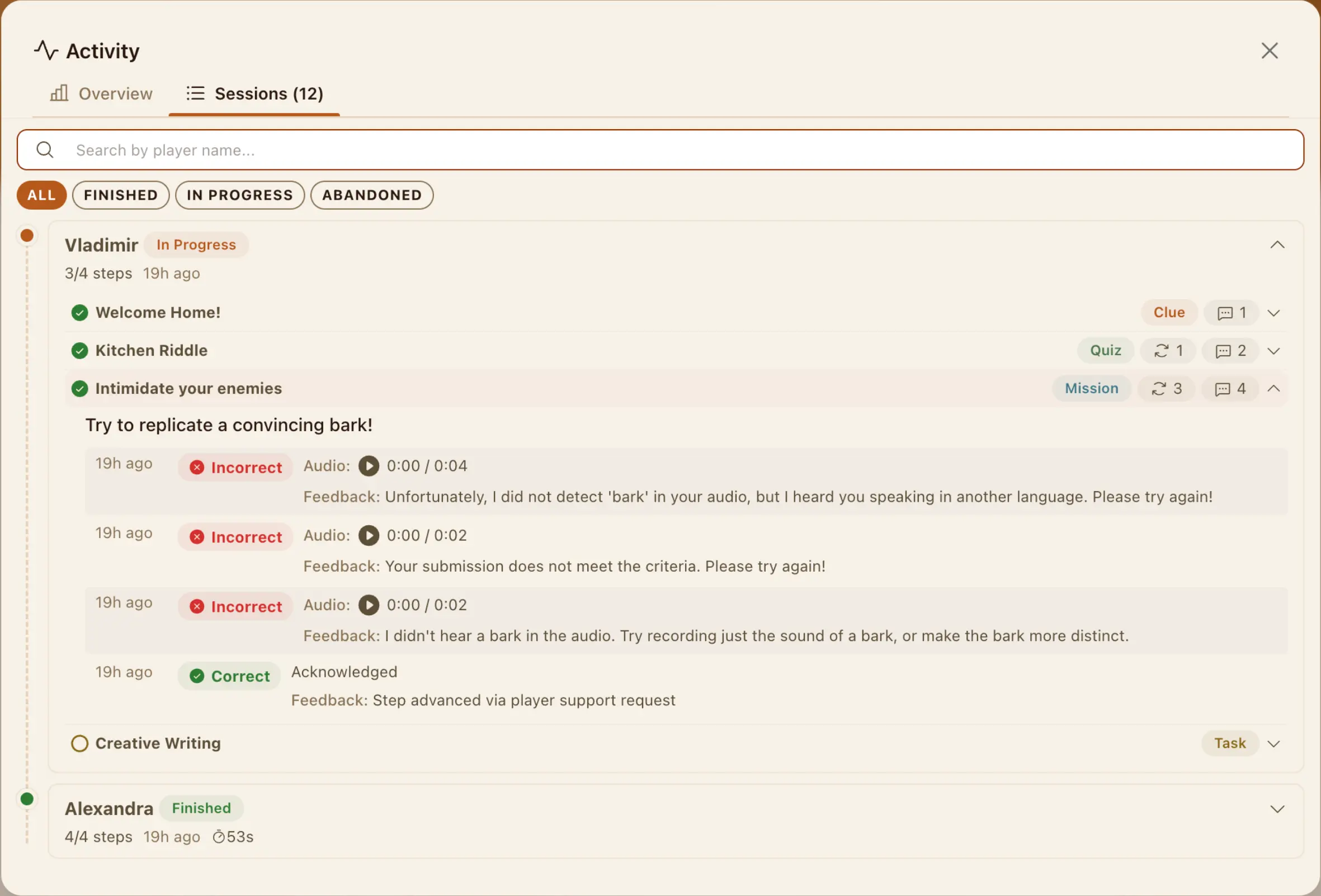 Sessions are locked to the hunt version that was live when the explorer started. Releasing a new version mid-play doesn't interrupt active explorers. localStorage persistence resumes from the last completed step.